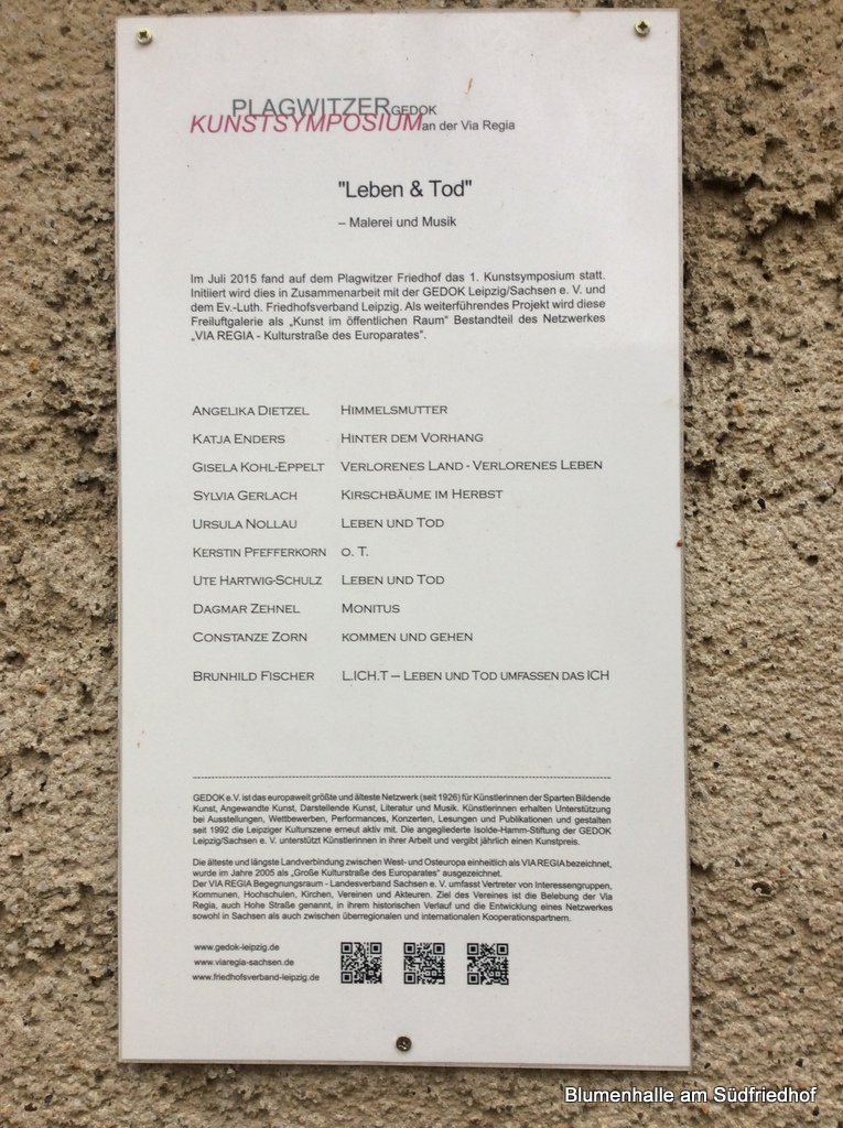 Im Juli 2015 fand das 1. Kunstsymposium auf dem Friedhof Plagwitz statt. Damit ist es folglich Bestandteil des Netzwerkes „VIA REGIA – Kulturstraße des Europarates“. Dabei beteiligten sich die Künstler der Gedok Leipzig/Sachsen e.V. und der Ev.-Luth. Friedhofsverband Leipzig.