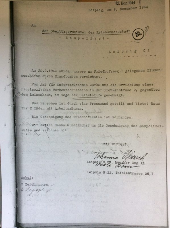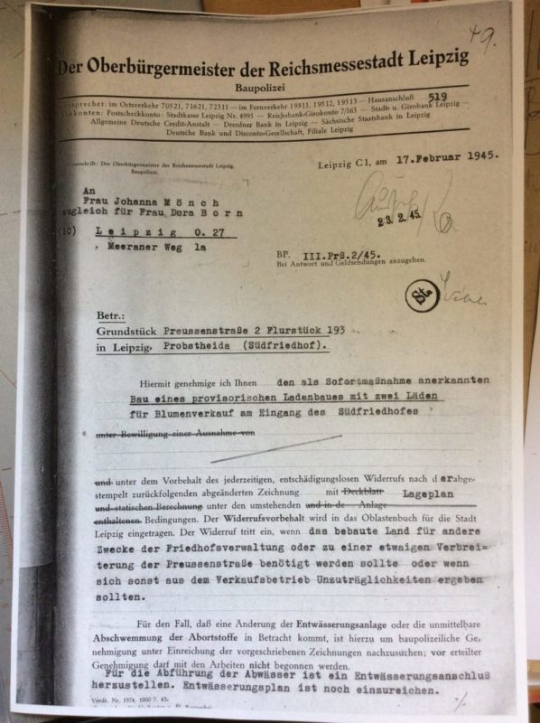 Die Blumenhändlerinnen Frau Dora Born und Fräulein Johanna Mönch erhielten Ende 1944 vom damaligen Amt für Sofortmaßnamen die Genehmigung am Osteingang des Südfriedhofes zu bauen.