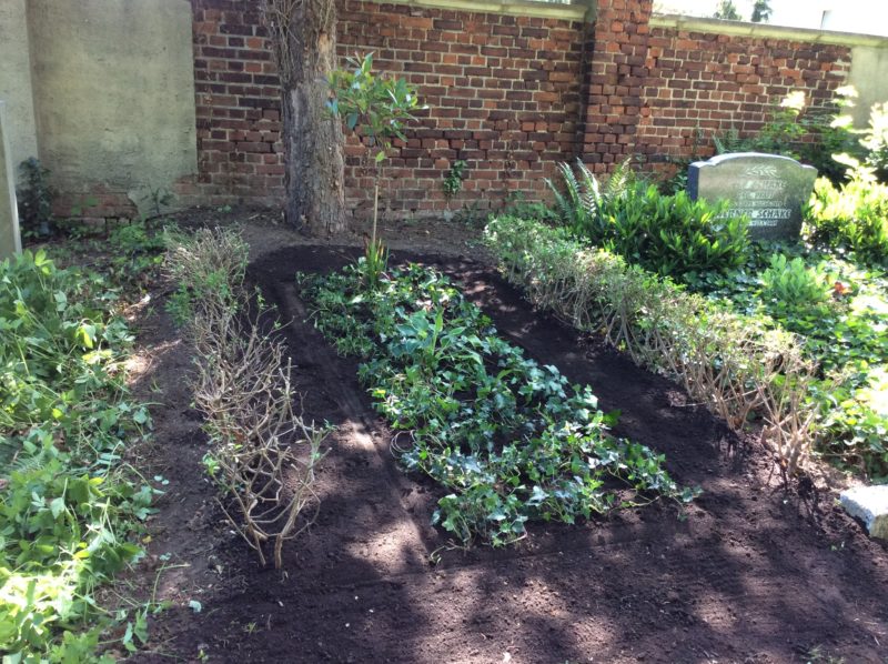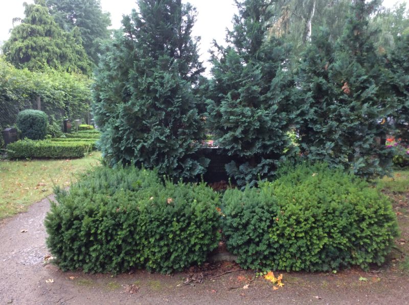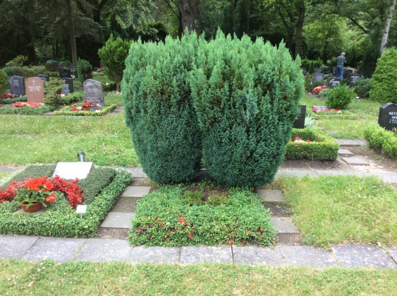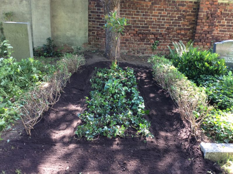 - Das doppelte Erdwahlgab soll bis auf die rechte Konifere gärtnerisch beräumt werden.