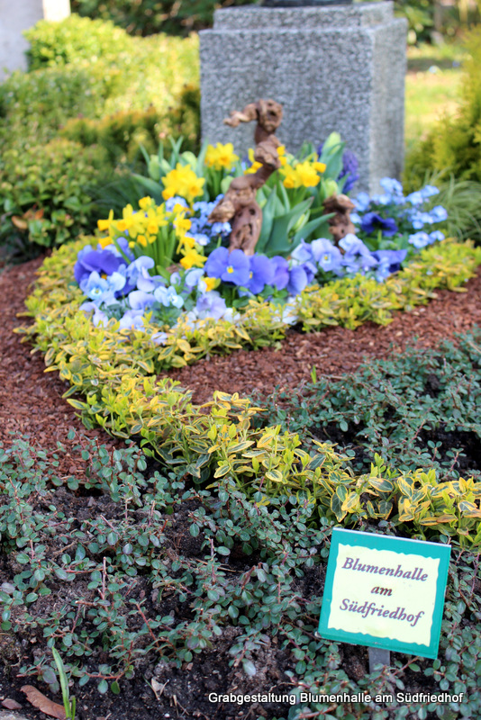 - Urnengrab mit Tulpen, Hornveilchen und Narzissen. Das Mustergrab der Blumenhalle am Südfriedhof