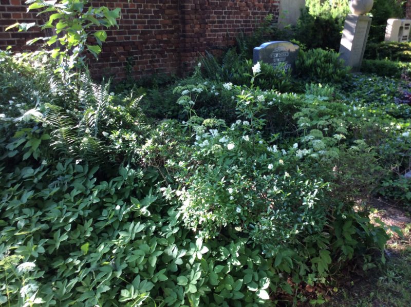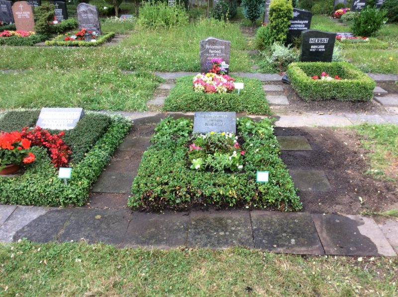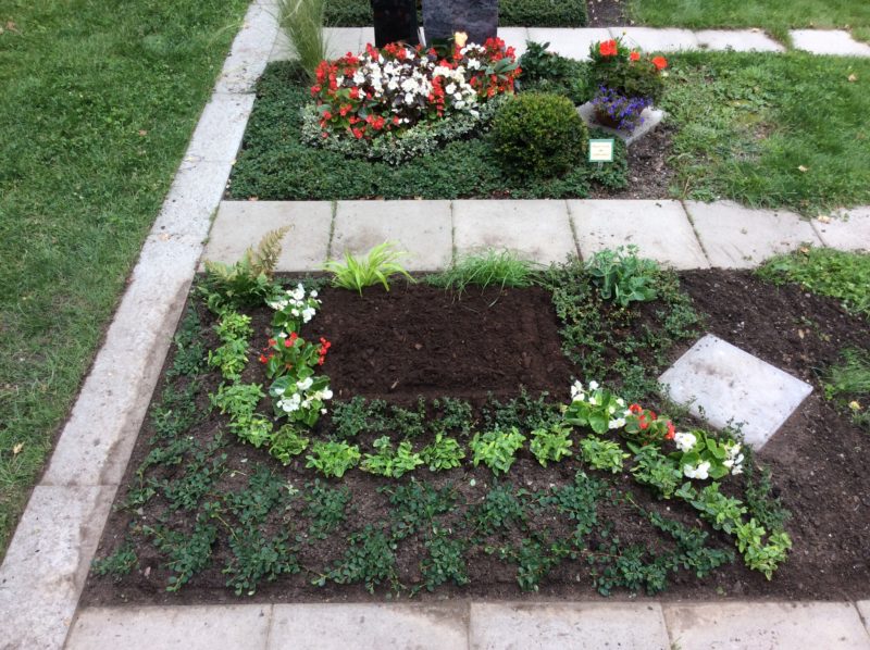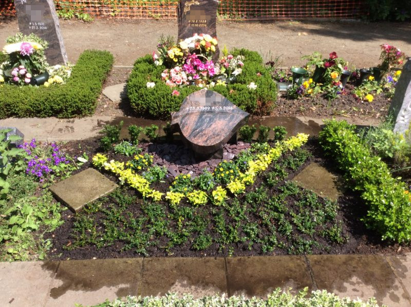- Urnenwahlgrab mit Cotoneaster, Waldsteinia und Euonymus ergänzt, Platten mit Kissenstein gehoben, Erde aufgefüllt, Koniferen entfernt und Sommerbepflanzung ergänzt