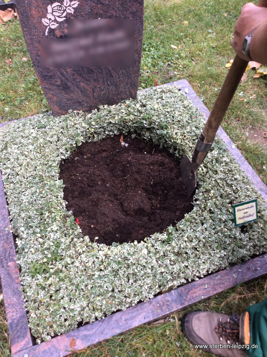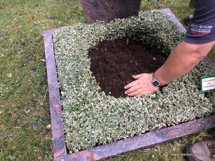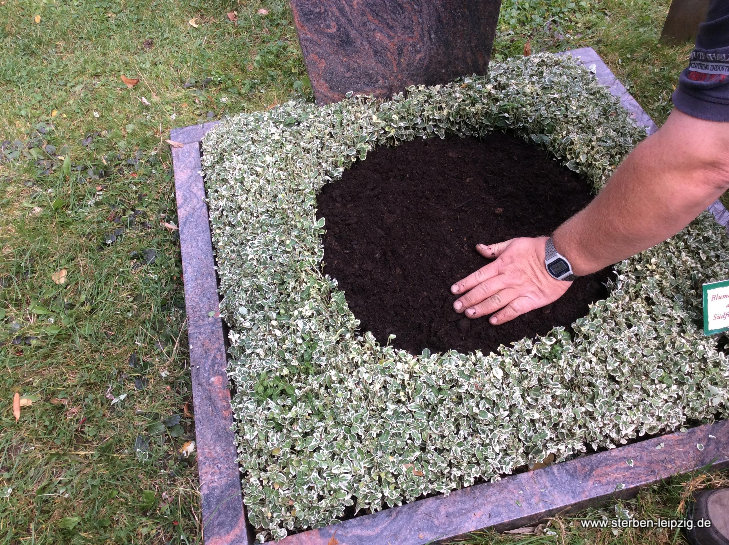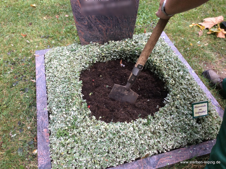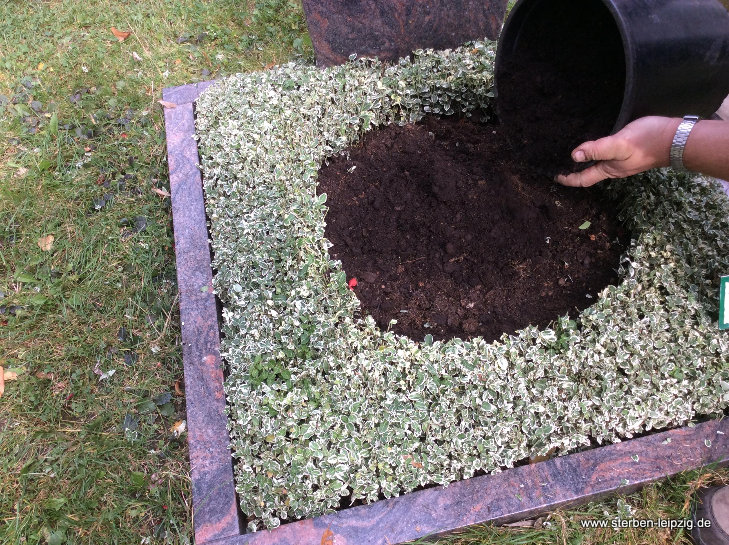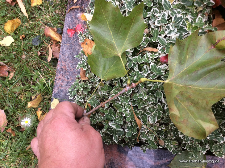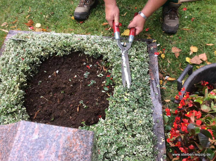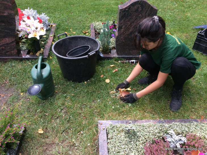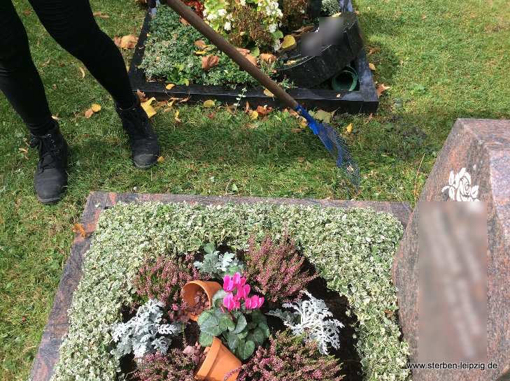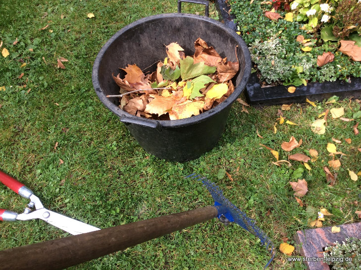 - Bei der Herbstbepflanzung sammeln wir bei Bedarf zuerst die Blätter vom Grab.