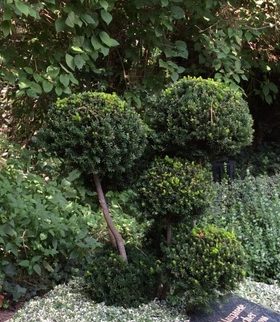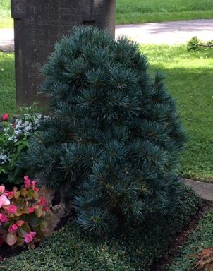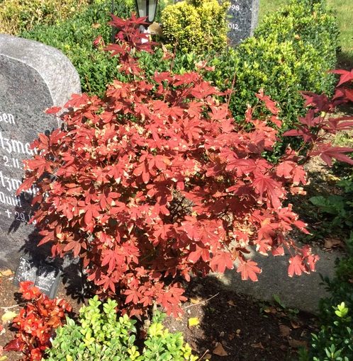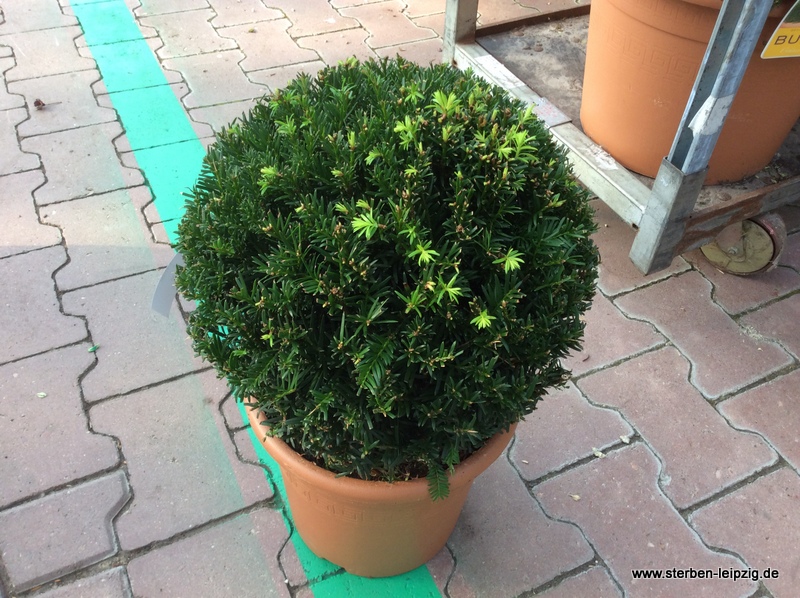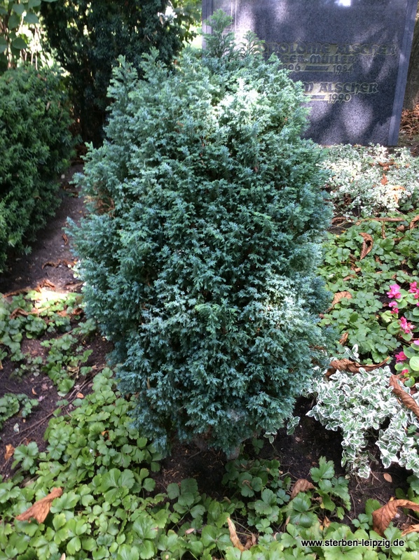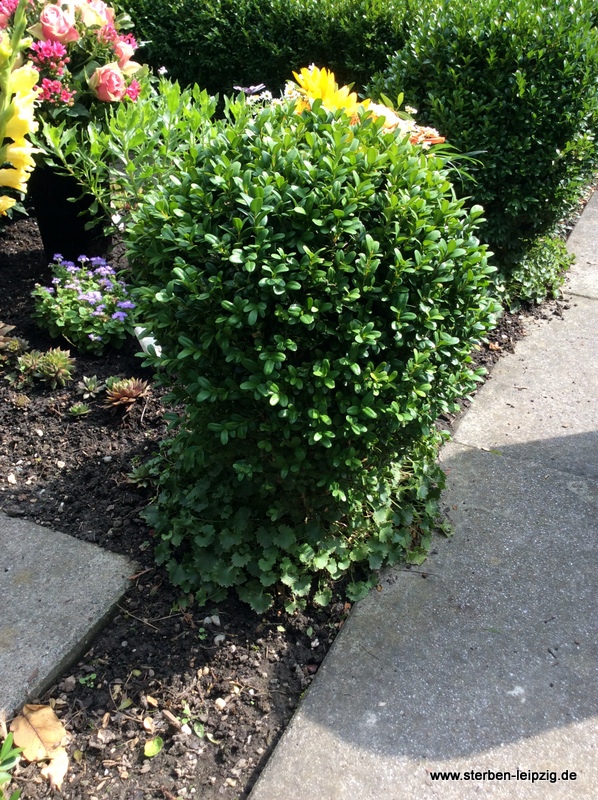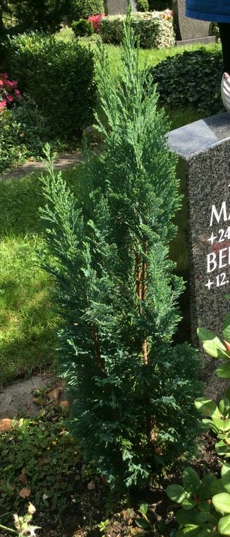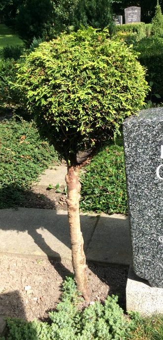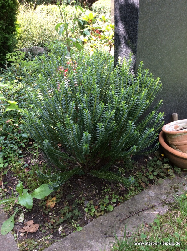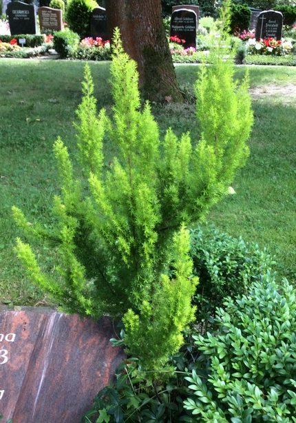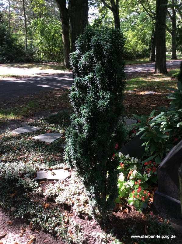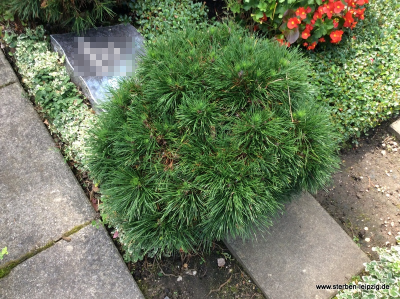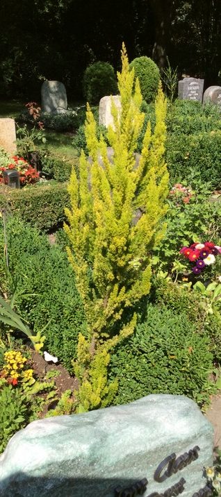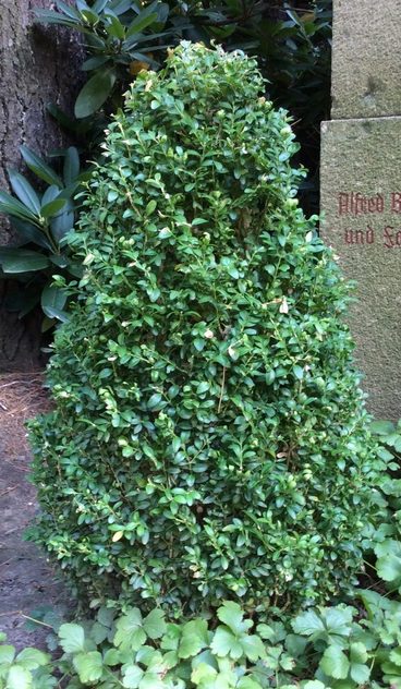 Wenn sich z.B. ein flacher Grabstein (Kissenstein) auf dem Grab befindet, könnte sicherlich ein ebenfalls flaches Gehölz dazu passen. Dazu könnte die Taxus-Kugel sowie auch ein schönes Gras sich gut eignen.